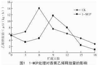 用 0.5 mg/L 的 1-MCP 對試驗材料進行處理。 稱取一定量 1-MCP 粉劑,將它溶于蒸餾水后密閉 于瓶中,搖勻,再將 1-MCP 藥劑瓶與待處理的香蕉 果實置于 PVC 塑料帳內,立即打開試劑瓶蓋,密閉 塑料帳,熏蒸 24 h 后打開 PVC 帳通風,對照組為不 做處理的香蕉果實。樣品處理完后,將樣品與對照 香蕉貯藏于 12 ℃、相對濕度為 80%的打孔聚乙烯 薄膜袋中,每 3 d 進行取樣測定,觀察貯藏效果。