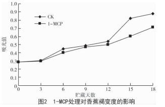 香蕉果實色澤的變化是反映香蕉后熟衰老的 一個重要依據。褐變發生時,果實的正常色澤發生 變化,影響果實的品質。由圖 2 可知,香蕉貯藏過程 中 2 組褐變度變化相似,呈現不斷遞增趨勢,但是 處理組的變化趨勢小于對照組。在貯藏 12 d 之前, 2 組香蕉果實的褐變度差異不明顯(P>0.05)。貯藏 第 15 天時,對照組的褐變度顯著上升,而處理組上 升較緩,二者之間呈現出顯著差異(P<0.05)。由此 表明,香蕉果實的酶促褐變在 15 d 后顯著被 1-MCP 抑制。