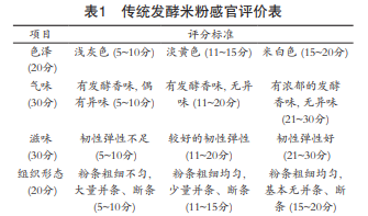 總酸(以乳酸計,g/kg):按照GB/T 12456— 2008《食品中總酸的測定》中的方法進行測定。 感官評定:由10人組成的感官評定小組對發酵米 粉進行評分,其中色澤20分,氣味20分,滋味30分, 組織形態30分,總計100分。各項目評分標準見表1。