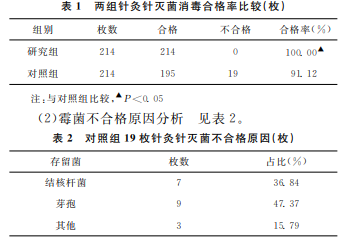 根據(jù)細(xì)菌培養(yǎng)結(jié)果,比較兩組針灸針 滅菌合格情況,分析針灸針消毒不合格的原因。