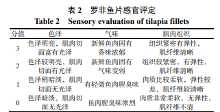 參照官愛艷等方法并稍作改 動。由 6 名感官評定人員組成感官評定小組,按照 表 2 要求對魚片進行評分,分值在 9 分(新鮮)和 0(完全腐敗)之間,5 分以下則表示魚肉不可食用, 最終結果取 3 項評分平均值并進行統(tǒng)計分析。