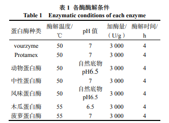 選用 Flavourzyme、 Protamex、動物蛋白酶、中性蛋白酶、風味蛋白酶、 木瓜蛋白酶、菠蘿蛋白酶,在各自最適條件下進行 酶解(表 1),以水解度、氮 N 回收率、短肽質量 濃度、短肽得率為指標綜合評價酶解效果。