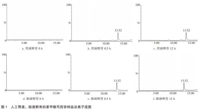稱取適量苯甲酰 芍藥苷,配制成濃度為 7.5 mg·mL-1 的 0.5% 羧甲基 纖維素鈉混懸液。人工胃液組與人工腸液組各取苯 甲酰芍藥苷混懸液 1 mL,分別加入人工胃液及人工 腸液 5 mL,每組平行 6 份樣品,混勻后將其放入搖床中(37 ℃,轉速 200 r·min-1 ),分別于放入搖床的 0、0.5、1、4、8、12 h 取樣 200 μL,加入 1 mol·L-1 NaOH 調節溶液 pH 值至 7,加入 1 mL 乙腈混勻,使 酶失活;離心(1 000 r·min-1 ,15 min),取上清液過 0.22 μm 微孔濾膜;用 UPLC-Q-TOF-MS/MS 法檢 測,采用 MSE 模式采集質譜數據,結合牡丹皮質譜 圖庫并利用 UNIFI 系統對采集得到的質譜數據進行 自動識別。UNIFI 數據庫包括化合物名稱、分子 式、實際相對分子質量、理論相對分子質量、保留 時間、誤差、響應值等。依據碎片離子峰裂解規 律、化合物極性大小、數據庫信息及相關對識 別出的化合物信息進行鑒定和確認。人工胃腸液孵 育實驗所得總離子流圖見圖 1,說明苯甲酰芍藥苷 在人工胃液和腸液中不發生代謝轉化。結果只檢測 到苯甲酰芍藥苷原型,未檢測到代謝產物。