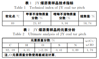 選用山西某焦油加工廠 所產的煤瀝青 (代 號 JY)作為 蒸 餾 原 料,將其粉碎研磨至粒度 80 目 左 右,密封保存備用。其技術指標如表1所示,元素分析如表2所示。