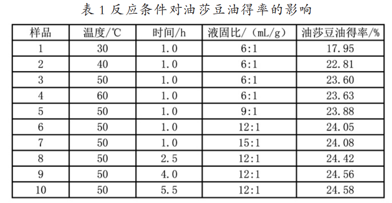 提取溫度、液固比、提取時間三個主要影響因素對油莎豆 油得率的影響如表 1 所示。從表中 1~4 數據可以看出,隨著 提取溫度的升高,油莎豆油的得率逐漸增大,一方面由于選用 的石油醚沸點為 30℃~60℃,當溫度超過 60℃后,會造成石 油醚回流速度過快。另一方面。溫度升高油氧化速度加快,每 升高 10℃,油脂氧化速度增加 1.5 倍 ,高溫也會導致油的品 質下降,因此提取溫度確定為 50℃。樣品 3、5、6、7 表明,增大 液固比有利于增加傳質推動力,提高油莎豆油的得率,當液固 比達到 12∶1 時,油脂得率趨于穩定,從油脂得率和操作成本 考慮,液固比選擇 12∶1。分析 6、8、9、10 實驗結果,隨著提取 時間的延長,油莎豆油得率逐漸增加,當達到 4 小時后變化較 緩慢,這說明 4h 提油基本完成。