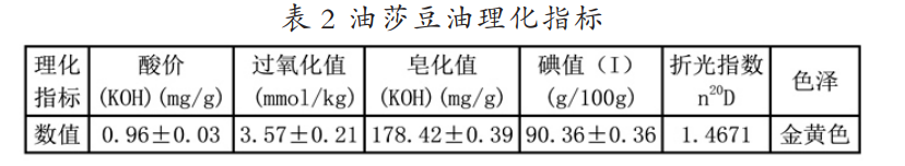 油莎豆油常見的理化指標如表 2 所示,油脂過氧化值、酸價均符合國家食用油的衛生標準。皂化值較大,說明脂肪酸分子量 較小,有助于人體吸收。碘值小于 130g/100g,屬于半干型油脂。