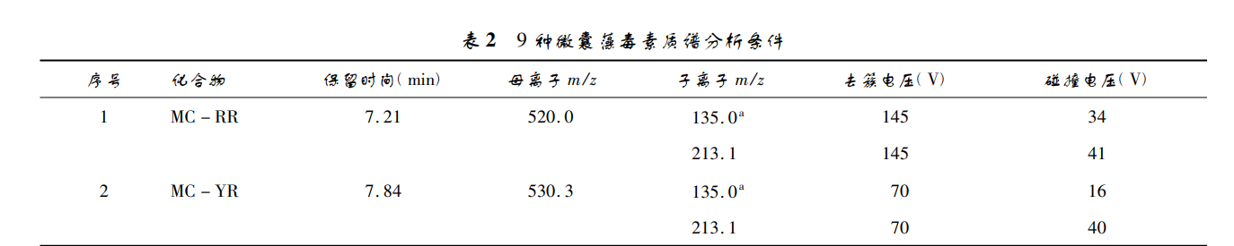 TRAP 5500 質譜儀( AB SCIEX) ; LC - 30A 超高效液相色譜( SHIMADZU) ; Milli - Q 超 純水儀( MILLIPORE 公司) ; 鼓風干燥箱( 上海博迅實業有限公司) ; 多管渦旋振蕩器( HELDOLPH 公司) ; 24 管氮吹儀( ORGANOMATION 公司) 。MC - RR( ≥ 95. 0% ,批號: L30195) 、MC - YR( ≥95. 0% ,批號: L30240) 、MC - HtYR ( ≥95. 0% ,批 號: L25556 ) 、 MC - LR( ≥95. 0% ,批 號: L29541 ) 、MC - WR ( ≥ 95. 0% ,批號: L30247) 、MC - LA( ≥95. 0% ,批 號: L30201) 、MC - LY( ≥95. 0% ,批號: L30199) 、MC - LW( ≥95. 0% ,批號: L30186) 、MC - LF( ≥95. 0% ,批 號: L30188) 均購自 ENZO life sciences; 甲醇( 色譜純, 批號: 1635007216 ) ; 甲 酸 ( ≥ 98. 0% ,批 號: X075- K150) 、氯化高鐵( 分析純,批號: 10011918) 、乙二醇 ( 分 析 純,批 號: 10009818 ) 、一 縮 二 乙 二 醇 ( 分 析 純,批號: 40014461) 、聚乙二醇10000( 化學純,批號:30151128) 、氨水( 優級純,批號: 10002108) 、鹽酸( 優 級純,批號: 10011008) ; 間氨基苯硼酸一水合物( 分析 純,批號: MKBX0579V) ; 10 μm ~ 30 μm 羧基化多壁 碳納米管; 0. 2 μm 一次性微孔濾膜。