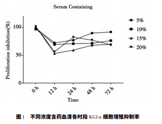 見圖 1。5% 、10% 、15% 、20% 含 藥血清對 KG1α 細胞從 12 h 即出現不同程度的增 殖抑制,隨著時間的推移,抑制效果有所減弱,以 15% 含藥血清的抑制效果最為明顯。不同濃度含藥 血清聯合化療藥對細胞均顯示出不同程度的抑制 作用。