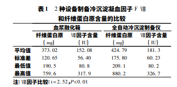 根據國家標準,冷沉淀中凝血因子Ⅷ的含量不少于 80 IU/袋,纖維蛋白原含量不少于 150 mg /袋。血漿融化箱制備 冷沉淀中凝血因子Ⅷ的含量約 80. 8 - 317. 9 IU,平均值為 152. 08 IU; 纖維蛋白原含量約 190. 5 - 759. 6 mg,平均值為 373. 02 mg,全自動冷沉淀制備儀制備冷沉淀中凝血因子Ⅷ 的含量約 80. 2-326. 7 IU,平均值為 181. 3 IU; 纖維蛋白原含 量約 209. 1-880. 2 mg,平均值為 424. 8 mg,均達到了國家標 準。冷沉淀中凝血因子Ⅷ、纖維蛋白原的回收率與抗凝劑、 全血保存時間和融化溫度等因素有關,且冷沉淀中的 FⅧ為 不穩定因子,受多種因素影響,所以每袋冷沉淀 FⅧ含量各 不相同,據報道正常個體中凝血因子 FⅧ水平相差在 50% - 200%之間。