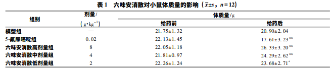 表 1 顯示,給藥前 各組小鼠體質量差異無統計學意義 ( P> 0. 05) ; 給藥后, 與模型組比較,5-氟尿嘧啶組小鼠體質量顯著下降,而六 味安消散組顯著增加 ( P<0. 05,P<0. 01) 。此外,模型組、 5-氟尿嘧啶組小鼠毛發暗淡,食欲不佳,精神萎靡; 六味 安消散組小鼠毛發光澤,食欲佳,精神良好。