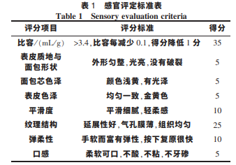 根據(jù) GB / T 20981—2007 制定 感官質(zhì)量評(píng)價(jià)標(biāo)準(zhǔn)表 (見(jiàn)表 1)。 感官評(píng)定小組由 10 人組成, 對(duì)冷卻 1 h 的酸面團(tuán)面包進(jìn)行感官評(píng)定,總 分為 100 分。