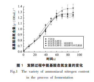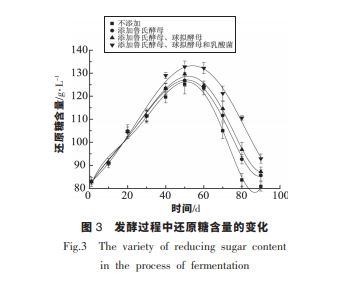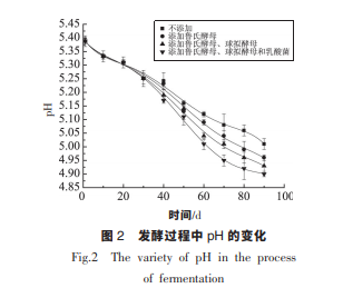 由圖 1 可知, 發(fā)酵 90 d, Ⅳ組添加了魯氏酵 母、 球擬酵母和乳酸菌制曲的醬油氨基酸態(tài)氮含 量最高,可達到 1.38 g/100 mL,Ⅰ組最低。 在發(fā)酵 過程中氨基酸態(tài)氮的含量趨勢呈現先增加后平 穩(wěn)。 在 50 d 以前,對照組高于試驗組,50 d 后對照 組中的氨基酸態(tài)氮含量基本趨于平穩(wěn)。 而試驗組 中的氨基酸態(tài)氮在前 60 d 一直保持上升趨勢,直 至 60 d 時才趨于平穩(wěn)。 這是由于添加魯氏酵母與 球擬酵母后,在前期酵母大量繁殖,消耗較多氨基 酸。 因此在 30~50 d 時,試驗組中的氨基酸態(tài)氮低 于對照組。 而 50 d 后,由于對照組中的氨基酸與 糖類發(fā)生美拉德反應消耗氨基酸, 而試驗組中的 這一過程發(fā)生在 60 d 后。由圖 2 可知,pH 呈現出不斷下降的趨勢,這 是由于在發(fā)酵過程中, 由于醬油中有機酸的不斷 產生。明顯可以看出,pH 下降最快的為Ⅳ組。這是 由于Ⅳ組添加了乳酸菌,乳酸菌可以利用糖類、檸 檬酸生成乳酸和醋酸, 從而產生以上現象。 并且pH 下降至 5 附近, 抑制了非耐酸雜菌的生長,同 時促進酵母的繁殖與發(fā)酵。 另外,酸性物質賦予了 醬油爽適的風味,改善醬油的口感。 并且酸性物質 的生成抑制了非耐酸微生物的繁殖, 但可以促進 醬油酵母的生長與繁殖,以及酒精發(fā)酵。由圖 3 可知,在發(fā)酵過程中,還原糖的含量呈 現先增加后減少的現象。 這是由于制曲時積累的 淀粉酶作用下,還原糖含量上升,和可利用多糖的 釋放。 而后期,由于美拉德反應以及微生物代謝 消耗還原糖,導致還原糖含量下降。