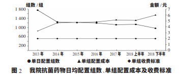 普通藥物日均配置組數、單組配置成本及收費標準 我院普通藥物的平均配置工作量為 6 529 組 /日, 平均單組配置成本為 3. 69 元 /組,收費標準為 1 元 /組。 其中,2013 年的平均配置組數最高,達 7 804 組 /日; 2018 年下半年的平均配置組數最低,僅為 3 607 組。 2016 年的單組配置成本最低,僅為 3. 02 元 /組; 2018 年 下半年的單組配置成本最高,達 6. 06 元 /組。由圖 1 可見, 隨著單日配置組數的下降,分攤后單組配置成本逐年上 升,但收費標準一直不變,且遠低于醫院的日常運行成本。我院抗菌藥物的平均配置工作量為 1 230 組 /日, 平均單組配置成本為 4. 82 元 /組,收費標準為 2 元 /組。 其中,2013 年的平均配置組數最高,達 1 749 組 /日; 單 組配置成本最低,僅為 3. 29 元 /組。2018 年下半年的平 均配置組數最低,僅為 964 組 /日; 單組配置成本最高, 達 5. 97 元 /組。由圖 2 可知,單日配置組數與分攤后單 組配置成本呈負相關,單日配置工作量越小,單組配置 成本越高。同時,收費標準一直遠低于醫院的日常運行 成本,成本與收益間的差距不斷擴大。