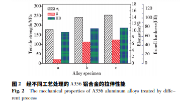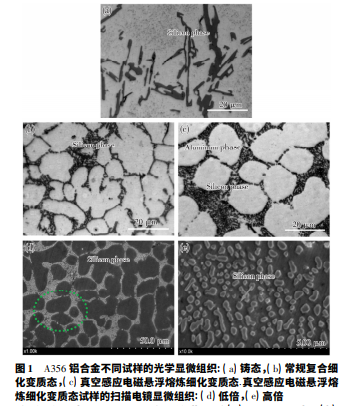 ( 1) 與常規復合細化變質 A356 鋁合金相比,在真空感應 電磁懸浮熔煉細化變質工藝條件下,A356 鋁合金的抗拉強 度、伸長率及布氏硬度分別提高了 4. 82%、9. 48%、1. 94%,可 見其力學性能明顯提高,尤其是塑性。