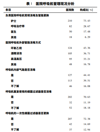 在調查的 286 家醫院中, 73. 43%的醫院呼吸機日常消毒和維護主要由護士負 責。43. 36%、36. 71%和 33. 21%的醫院分別采用環氧 乙烷、酒精浸泡、高溫高壓的方式對呼吸機外部管路消毒。44. 41% 的醫院對呼吸機內氣路進行消毒, 70. 63%的醫院能夠對呼吸機重復使用的細菌過濾器 進行消毒,72. 38%的醫院能夠對呼吸機一次性細菌過 濾器進行更換。見表 1。