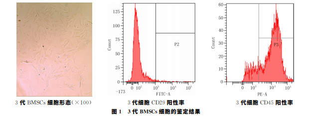 初次換液后原代細胞呈集 落分布于培養瓶,經傳代后均勻生長,3代細胞均勻 分布,細胞呈梭形。3代細胞表型 CD29、CD45的陽 性率分別為82.4%、2.0%,見圖1。