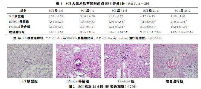 SCI模型組:脊髓損傷模型制作成 功后 逐 層 關 閉 切 口,30 min 后 腹 腔 注 射 1 mL 的 0.9%氯化鈉注射液。BMSCs移植組:脊髓損傷模型 制作成功后30min腹腔注射1mL的0.9%氯化鈉注 射液,術后5d沿原切口切開暴露脊髓損傷節段,硬 膜下注射10μL的1×106/μL骨髓間充質干細胞單 細胞懸液。Fasdiual治療組:脊髓損傷模型制作成功 后30min腹腔注射1mL的Fasdiual(0.85mg/kg), 術后5d沿原切口切開暴 露 脊 髓 損 傷 節 段,硬 膜 下 注射10μL0.9%氯化鈉注射液。聯合治療組:脊髓 損傷模型制作成功后 30 min 腹 腔 注 射1mL Fasdiual(0.85mg/kg),術后5d天沿原切口切開暴 露脊髓損傷節段,硬膜下注射10μL1×106 個/μL骨 髓間充質干細胞單細胞懸液。