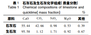 由表 1 可知: 石灰石的主要成分是氧化鈣和 二氧化碳,石灰石經高溫煅燒后制得的生石灰的 主要成分為氧化鈣. 由圖 1 可知: 石灰石中的主要 物相為碳酸鈣,生石灰的主要物相為氧化鈣. 由圖 2 可 知: 經激光粒度分布 儀測試,其 d50 為90. 65 μm.實驗所用氯化銨為工業級優等品( NH4Cl, w≥99. 5% ) ,所用水均為二次蒸餾水,分析用藥 品均為分析純.