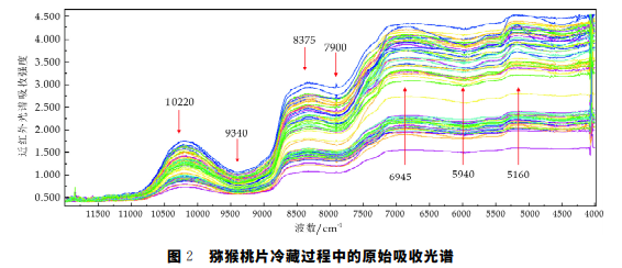 圖2為4 ℃冷藏條件下鮮切獼猴桃片樣品全 波數范圍(4000~12000cm-1)內的 近 紅 外 原 始 吸收光譜圖.可 以 看 出,鮮 切 獼 猴 桃 片 在 各 檢 測 時 間的光譜峰形大致相同,整體趨勢類似,可能是因 為所制備的鮮 切 獼 猴 桃 片 均 為 同 品 種、同 批 次.在 掃描波數范圍4000~12000cm-1內包含非常豐 富的光譜吸收信息,在10220cm-1、9340cm-1、 8375cm-1、7900cm-1、6945cm-1、5940cm-1、 5160cm-1等處可觀察到明顯的波谷或波峰形成. 隨著光譜曲線的增多,不同冷藏時間鮮切獼猴桃片 的近紅外光譜重合交叉比較嚴重,較難直接從光譜 曲線中區分不同冷藏時間的獼猴桃片.