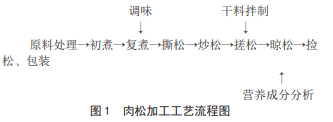 參照安徽昊東食品科技有限公司肉松生產(chǎn)工藝流 程,結(jié)合實(shí)驗(yàn)室具體情況,肉松加工制備工藝流程如 圖 1 所示。