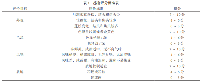 水分含量的測(cè)定:根據(jù)國(guó)家標(biāo)準(zhǔn) GB 5009.3-2016 《食品中水分的測(cè)定》;脂肪含量的測(cè)定:采用國(guó)家 標(biāo)準(zhǔn) GB 5009.6-2016《食品中脂肪的測(cè)定》中酸水解 法;蛋白質(zhì)含量測(cè)定:采用國(guó)家標(biāo)準(zhǔn) GB 5009.5-2016 《食品中蛋白質(zhì)的測(cè)定》中凱氏定氮法;鈣含量的測(cè)定: 采用 EDTA 滴定法 ;葉酸含量的測(cè)定:采用熒光分 光光度計(jì)法。 1.5 感官評(píng)定標(biāo)準(zhǔn) 感官評(píng)分總分為 40 分,分為 4 項(xiàng),每項(xiàng)滿(mǎn)分 10 分, 分項(xiàng)標(biāo)準(zhǔn)見(jiàn)表 1。