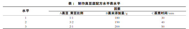 在單因素試驗的基礎上,就影響臭豆腐感官品質的 3 個主要因素:黑豆、黃豆添加 比例、黑米添加量和黑米豆腐胚蒸煮時間進行 3 因素 3 水平正交試驗,并從色澤、氣味、滋味、形態 4 個 方面進行感官評價(滿分均為 10 分),得出臭豆腐制作的最佳工藝條件.在單因素優化試驗基礎上進行 成品臭豆腐品質優化的 L9(33 )正交試驗,正交試驗因素水平表如表 1 所示.