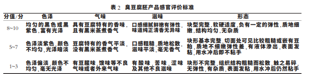臭豆腐是我國的傳統美食, 是中國傳統大豆發酵制品的一種.大豆發酵使部分蛋白質的硫氫基和氨 基游離出來,產生硫臭和氨臭, 但以硫化物的臭味為主, 同時臭豆腐中大量的丙氨酸表現出獨特的甜味 和酯香味,使其具有“聞起來臭,吃起來香”的特點.臭豆腐以優質的黃豆為原料,經過磨漿、洗漿、煮漿、 點鹵、壓胚等步驟制作成豆腐胚,然后進行上色、加鹵、發酵,再進行油炸,最后搭配調好口味的蘸料,即 完成一份完整的臭豆腐.豆腐富含蛋白質、鈣質和大豆異黃酮,其發酵而成的臭豆腐蛋白質含量可以達 到 15%~20%,和肉類蛋白質的含量相當.豆腐胚經過發酵,蛋白質分解成各類氨基酸,有利于人體對蛋 白質的吸收.據研究報道,臭豆腐中維生素 B12 的含量豐富(0.1 ug·g-1),維生素 B12 可以延緩大腦老化 進程,降低老年癡呆的發病率.相關研究還表明,臭豆腐可以中和脾胃、消除脹氣、寒中益氣、清熱活血、 去濁氣.可見,臭豆腐是一種集營養價值和藥用價值于一身的風味小吃. 目前市場上的黑色臭豆腐大多由豆腐胚經過青礬溶液浸泡,再放入老鹵水中腌制入味制得,經浸泡 而制成的臭豆腐色澤深黑,口感獨特.天然青礬的主要成分是 FeSO4 ·7H2O,作為一種食品添加劑,若使用 過量,易造成食品內部 FeSO4 ·7H2O 殘留,進而對人體呼吸道、食道和口腔黏膜產生刺激性,長期過量食 用會引起腹痛等不良反應,甚至增加癌癥患病率.因此,本研究以黑豆、黑米代替青礬對豆腐胚進行物 理著色,旨在開發一種臭豆腐制作新工藝配方,從而提高臭豆腐的食品安全性,提升臭豆腐的口感和風 味,縮短臭豆腐的發酵周期.