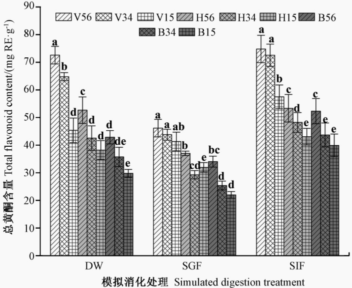 由圖2可知,在荷葉直徑相等和消升方式相同的情況下,不同熱處理中,真空微波組荷葉總黃酮釋放量高于濕熱蒸汽組和煮沸處理組,其中,V56組荷葉總黃酮釋放量最高,B15組最低;在相同熱處理不同消化方式下,與DW組相比,模擬胃液消化使真空微波、濕熱蒸汽和煮沸處理組中荷葉的總黃酮含量降低,而模擬腸液消化則提高其總黃酮的釋放量。上海博迅醫(yī)療生物儀器股份有限公司發(fā)現(xiàn)在不同熱處理相同消化方式下,真空微波處理組中的總黃酮釋放量顯著高于濕熱蒸汽和煮沸處理組,此外,直徑較大的荷葉總黃酮釋放量最高,直徑最小的荷葉總酚釋放量最低。綜上,真空微波處理較其他熱處理方式的提取效果好,荷葉總黃酮釋放量隨著荷葉直徑增大而增加;與去離子水組相比,模擬胃液消化處理會(huì)降低不同熱處理組荷葉中總黃酮的釋放量,而模擬腸液消化處理會(huì)增加荷葉總黃酮釋放量。