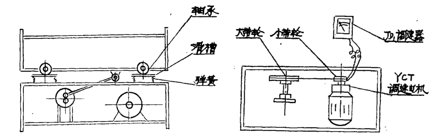 YCT電機雖屬恒轉矩無級調速,但在控制器工作時給予的直流電壓大小,影響到磁場強弱變化則輸出功率不穩定,瞬時功率有所減小。鑒于以上情況,YCT調速電機轉速范圍最好定在600rpm左右,而通過 第二次變速裝置,則可達到亞型搖床的頻率為100rpm左右,在制造過程中,考慮整機尺寸緊湊 , 二次變速時 大、小皮帶輪直徑比在右1~ 3 : 1之間選擇。