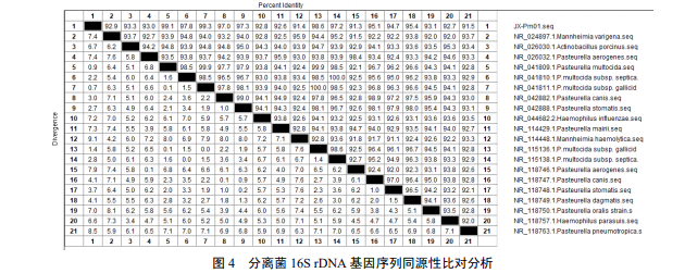 分離株 JX-Pm01 的基 因片段長度為 1 443 bp,所得序列與 NCBI 基因庫 BLAST 中多 殺性巴氏桿菌 16S rDNA 基因序列同源性達 100%,初步判定該 分離菌株為多殺性巴氏桿菌。選取 BLAST 同源性檢索中與分離 菌同源性較高的多殺性巴氏桿菌殺禽亞種(Pasteurella multocida subsp. gallicida)、多殺性巴氏桿菌敗血亞種(Pasteurella multocida subsp. septica)、咬傷巴氏桿菌(Pasteurella dagmatis)、 犬巴氏桿菌(Pasteurella canis)、咽巴氏桿菌(Pasteurella stomatis)、 口巴氏桿菌(Pasteurella oralis)、買氏巴氏桿菌(Pasteurella mairii)、產氣巴氏桿菌(Pasteurella aerogenes)、豚放線桿菌 ( Actinobacillus porcinus )、流感嗜血桿菌( Haemophilusinfluenzae)、副豬嗜血桿菌(Haemophilus parasuis)、多源曼氏桿菌(Mannheimia varigena)、溶血性曼 氏桿菌(Mannheimia haemolytica)與分離菌 JX-Pm01 的 16S rDNA 基因序列進行同源性比對分析,結果如 圖 4。 結果表明JX-Pm01 與巴氏桿菌核苷酸相似性達 91.3%~99.3%,與多殺性巴氏桿菌同源性達99.1%, 其中多殺性巴氏桿菌殺禽亞種與 JX-Pm01 同源性最高,達 99.3%,進一步表明分離株為多殺性巴氏桿 菌殺禽亞種。而與同科的豚放線桿菌、流感嗜血桿菌、副豬嗜血桿菌、多源曼氏桿菌、溶血性曼氏桿 菌核苷酸同源性高達 91.4%~97.3%,說明巴氏桿菌各種屬之間的差異性較小,尤其與咽巴氏桿菌的同 源性達 97.3%。