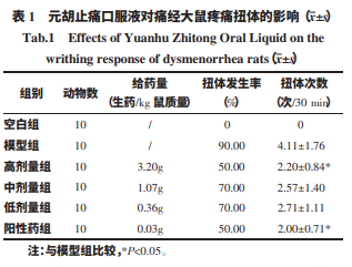 空白組大鼠未出現(xiàn)扭體反應(yīng), 模型組大鼠在注射縮宮素后 30 min 內(nèi)的扭體發(fā)生 率為 90%,提示動物模型成功建立。與模型組相比, 陽性藥組、高劑量組、中劑量組、低劑量組大鼠扭體 發(fā)生率均有不同程度的降低,其中高劑量組與陽性 藥組大鼠扭體反應(yīng)次數(shù)顯著減少,差異具有統(tǒng)計學(xué) 意義(P<0.05),詳見表 1。