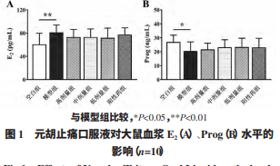 與正常大鼠相比,原發(fā)性 痛經(jīng)模型大鼠血漿 E2 水平顯著升高(P<0.01),血漿 Prog 水平顯著降低(P<0.05)。但陽性藥與元胡止痛 口服液給藥后,模型大鼠血漿 E2 與 Prog 水平均未 見顯著回調(diào)。見圖 1。